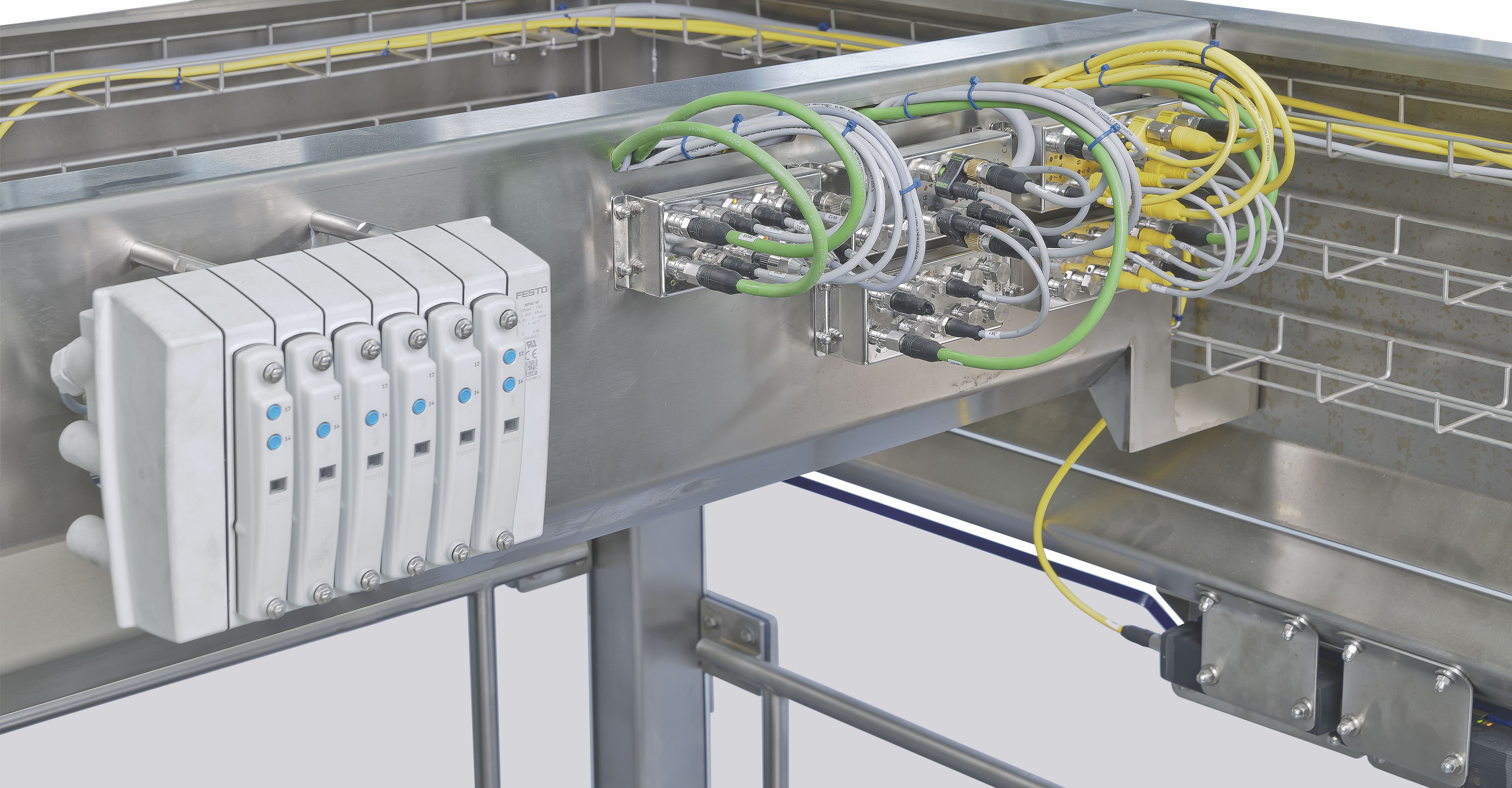 Parallelle bedrading van afzonderlijke kabels over roestvrijstalen schermen in de levensmiddelensector is uiterst gecompliceerd. Het Cube systeem maakt een directe procesverbinding met een enkele systeemverbinding mogelijk.